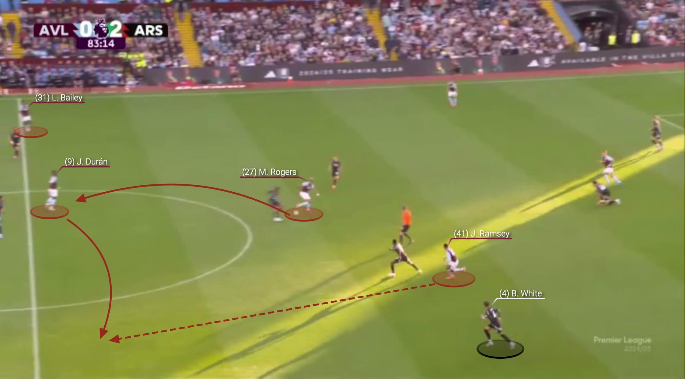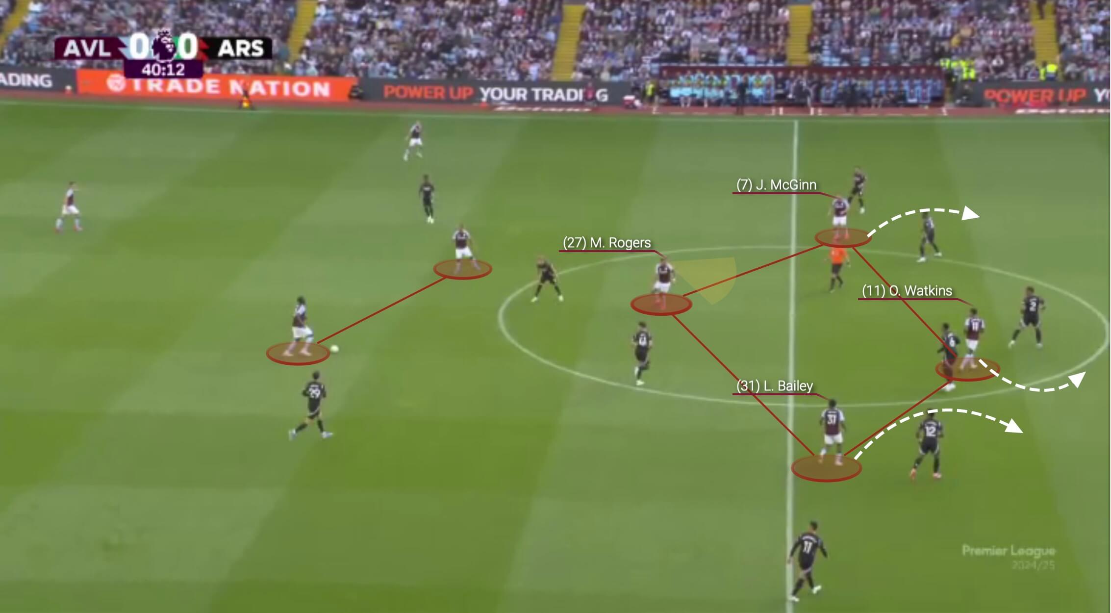 في كثير من الأحيان، يلعب فيلا على الجانب الأيسر مع ماكجين – صاحب الرقم 10 الآخر في الفريق – الذي يمسك بالكرة، قبل تمريرها إلى أقرب لاعب وسط مركزي. وهذا يولد تحركًا قطريًا واسع النطاق يحول اللعب إلى روجرز أو ليون بيلي، وهو حامل كرة رئيسي آخر لإيمري.