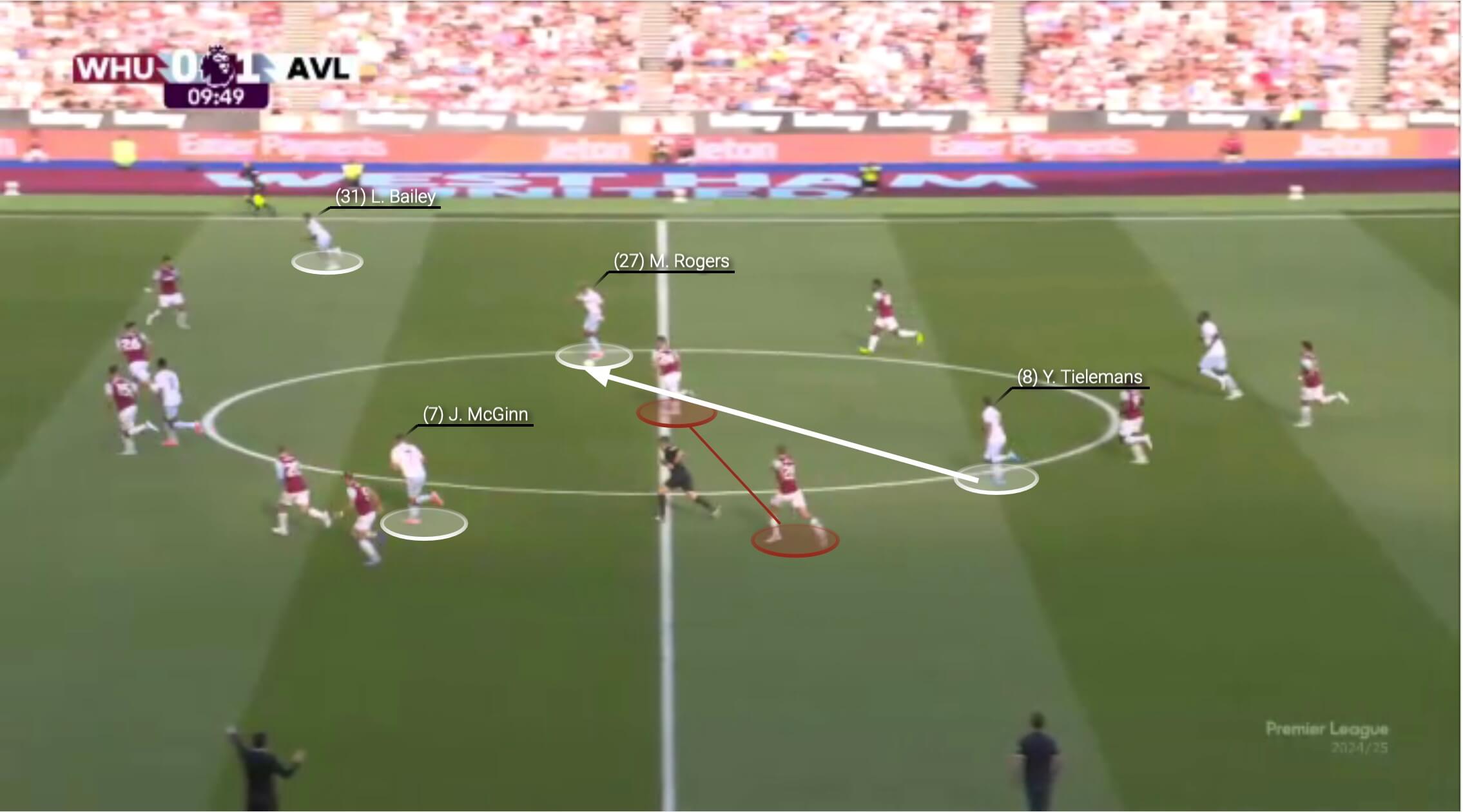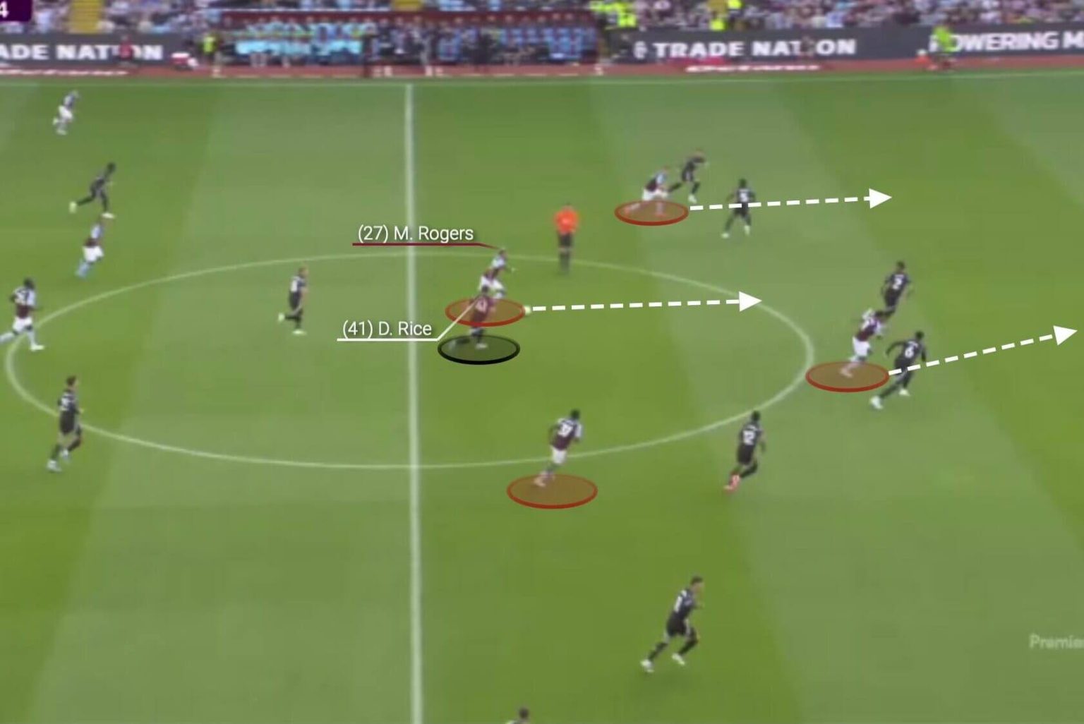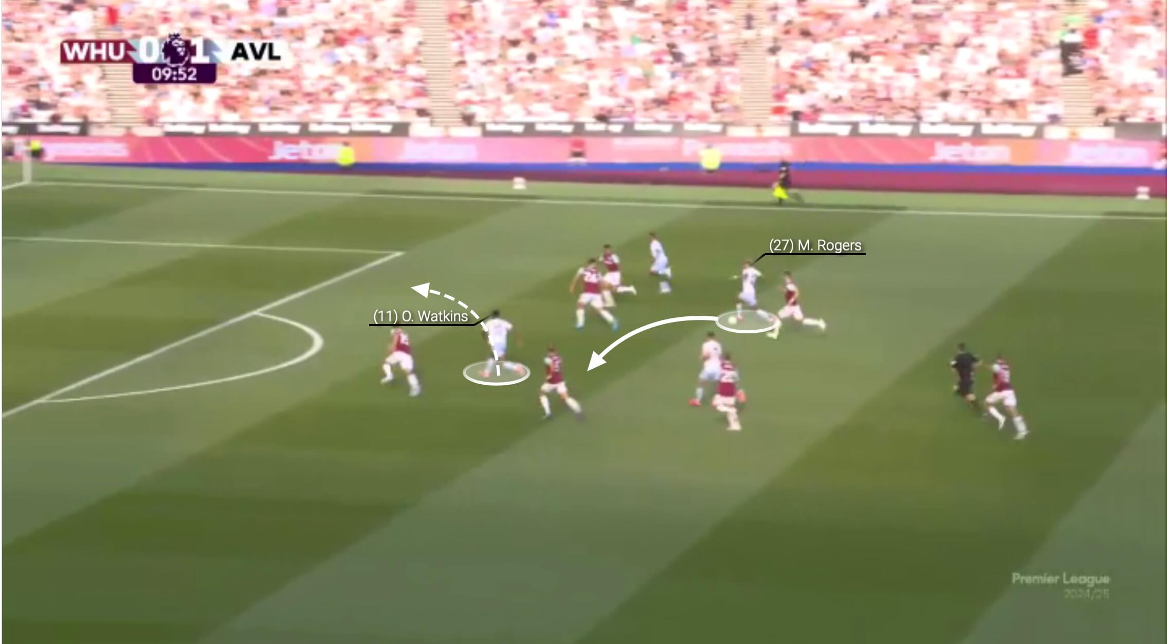 هنا، في عطلة نهاية الأسبوع الافتتاحية لهذا الموسم، يقوم واتكينز بمحاولة وهمية لانتزاع الكرة من مدافع وست هام وإخلاء المساحة لروجرز للانطلاق إليها ثم التسديد.