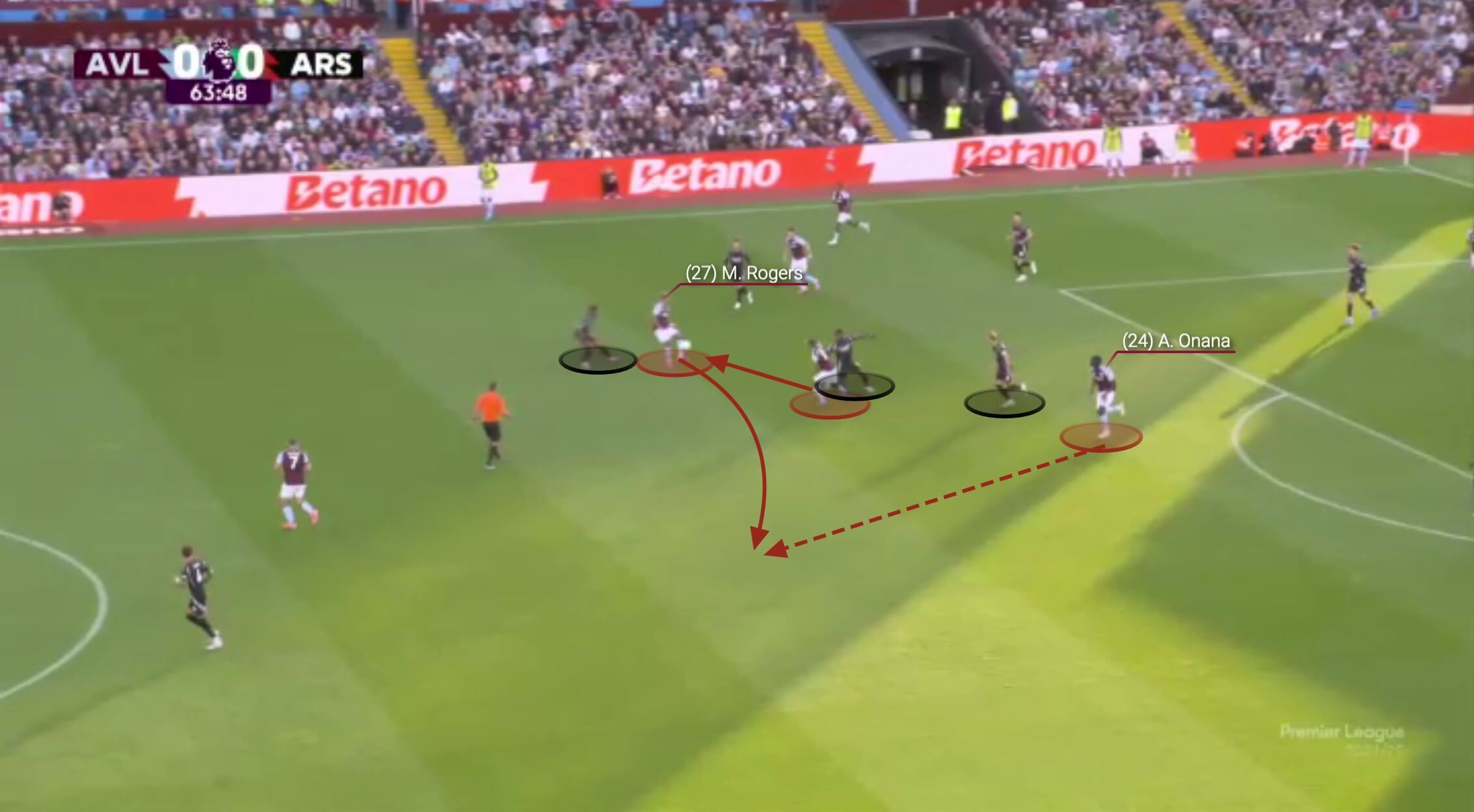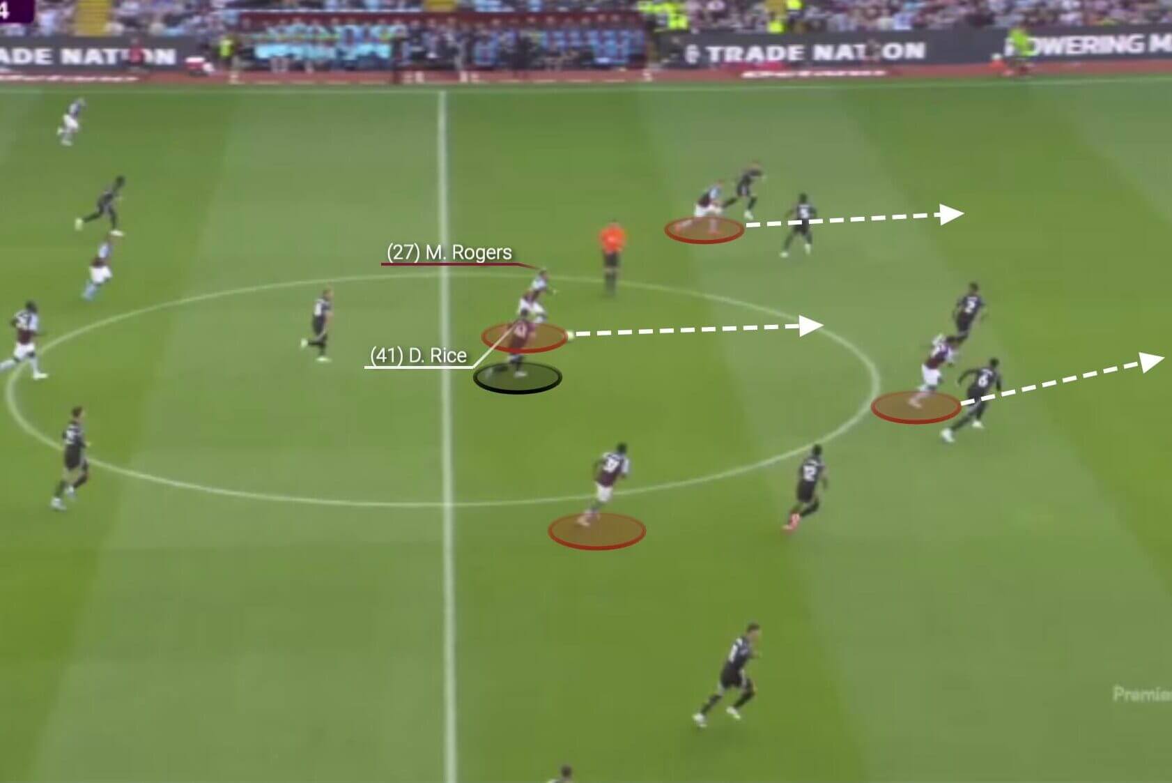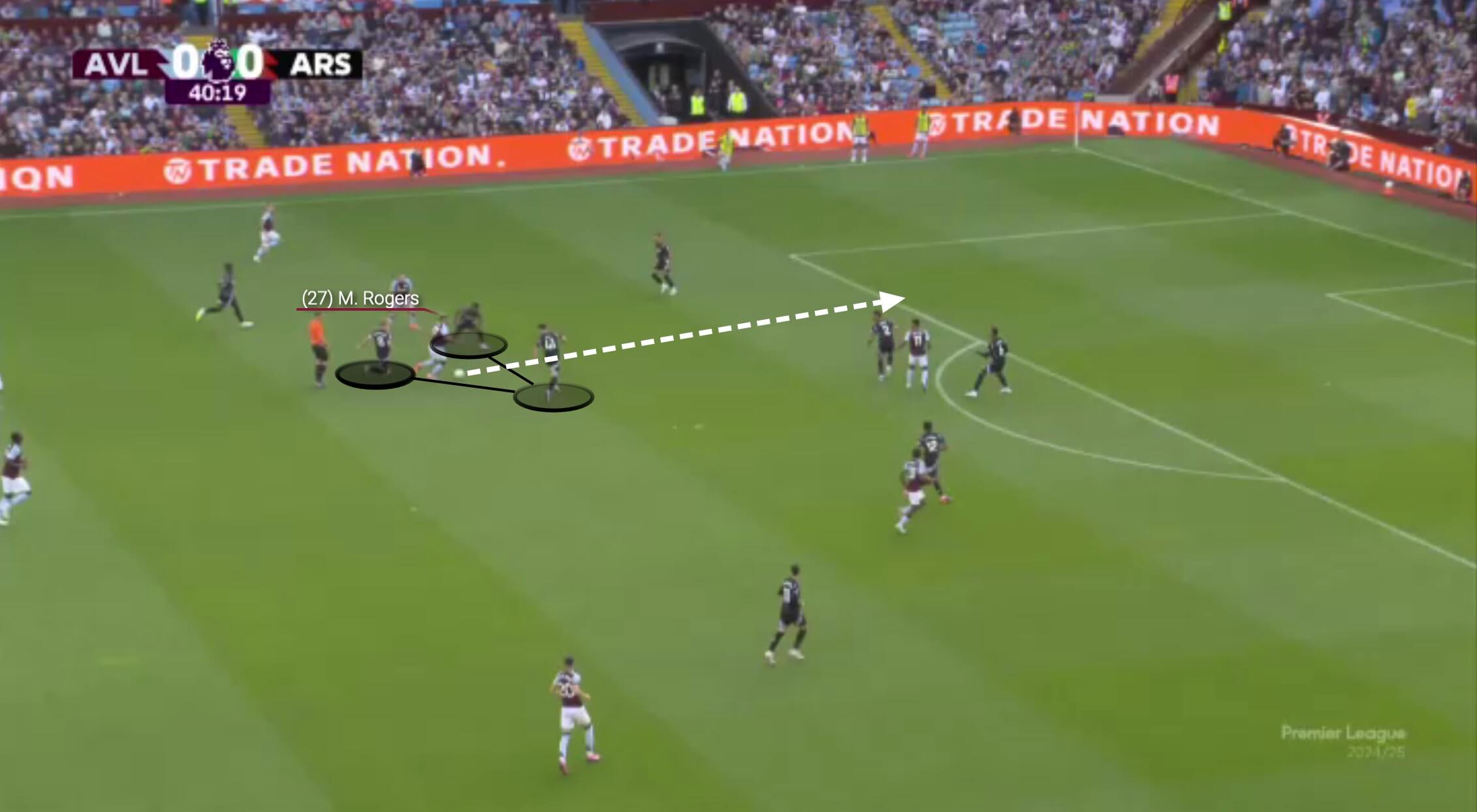 قام إيمري بنقل روجرز إلى مركز الوسط في فترة ما قبل الموسم، وطلب منه اللعب كمهاجم ثانٍ عميق خلف أولي واتكينز بدلاً من اللعب كصانع ألعاب أيسر. وهذا يسمح لروجرز بالبقاء في مناطق أكثر ملاءمة للهجوم من خلال فقدان الكرة وعدم التعمق كثيرًا، بعد تتبع ظهير الفريق المنافس. على مدار الأشهر الـ12 الماضية، احتل روجرز المرتبة السادسة في المائة من لاعبي خط الوسط المهاجمين في الدوريات الخمس الكبرى في أوروبا من حيث المراوغة الناجحة (54.8 في المائة).