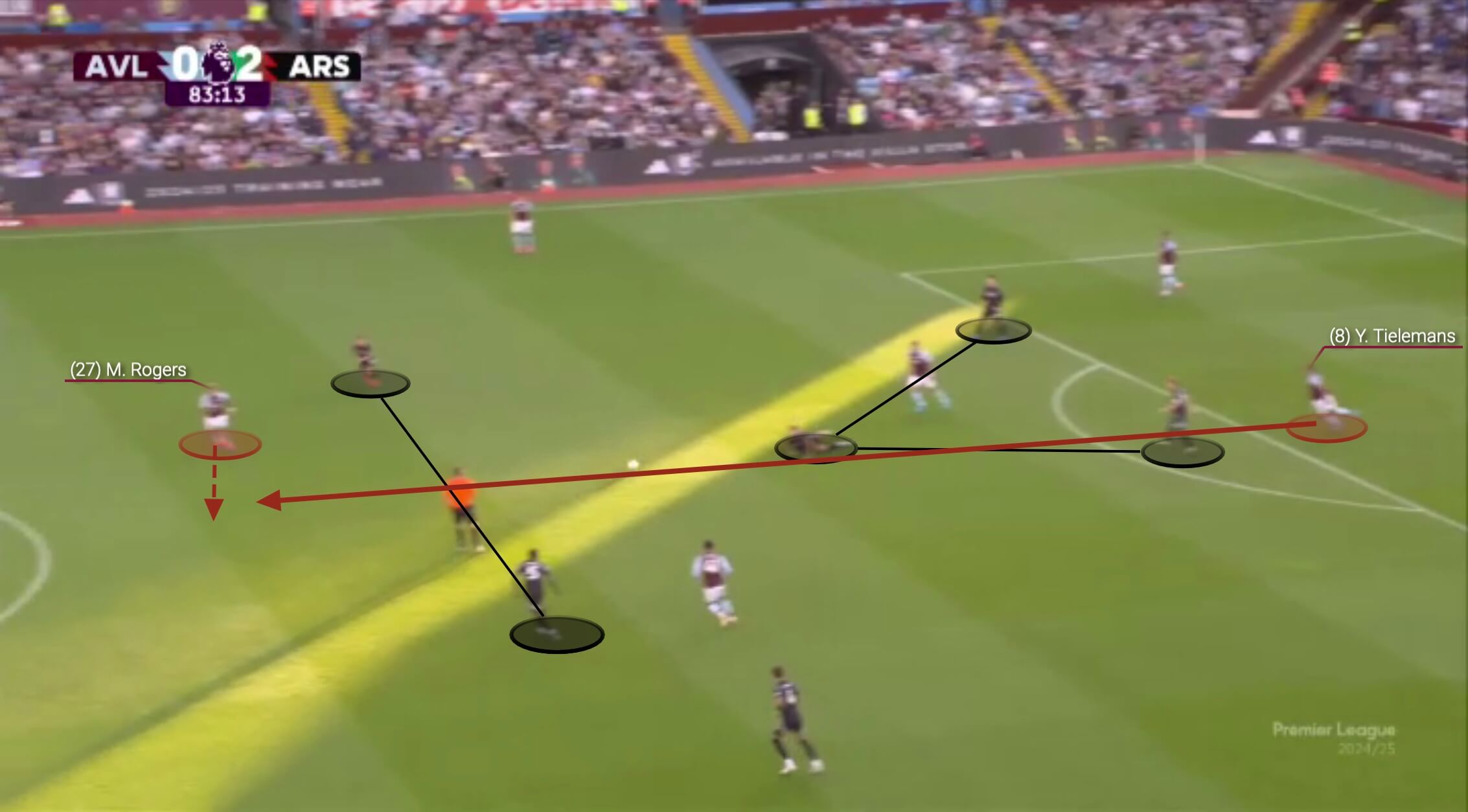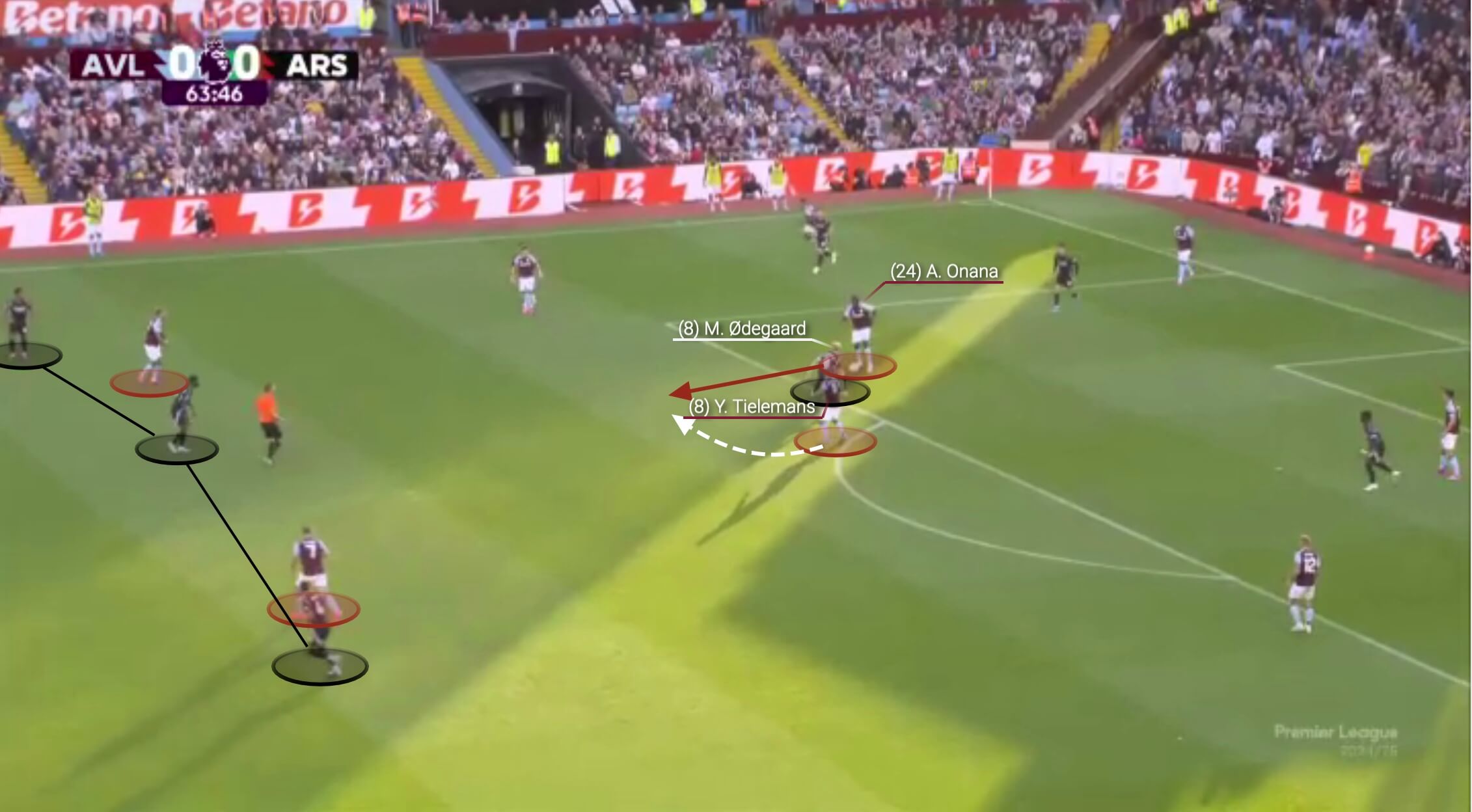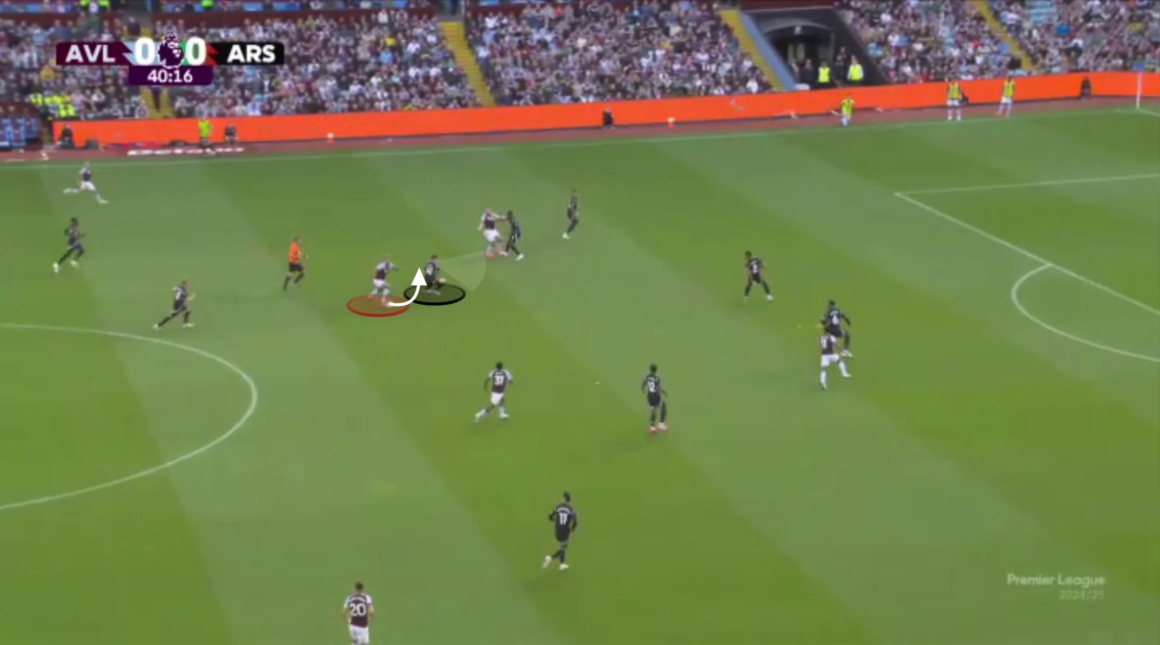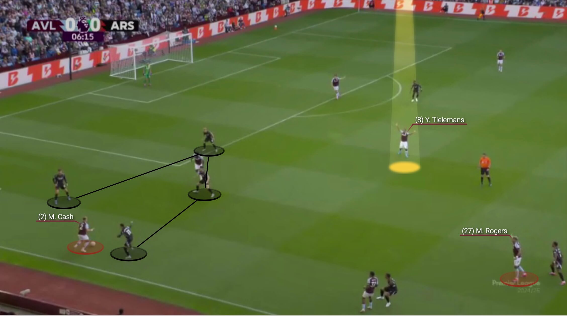 كان نظام الضغط الذي يتبعه آرسنال يهدف إلى إجبار فيلا على التراجع إلى أحد جانبي الملعب. واستهدفوا ماتي كاش، مع علمهم بأنه سيستحوذ على الكرة عند خط التماس. لكن إيمري أبقى لاعبيه في وضع مرتفع، تاركين تيليمانس كلاعب خارج الملعب.
