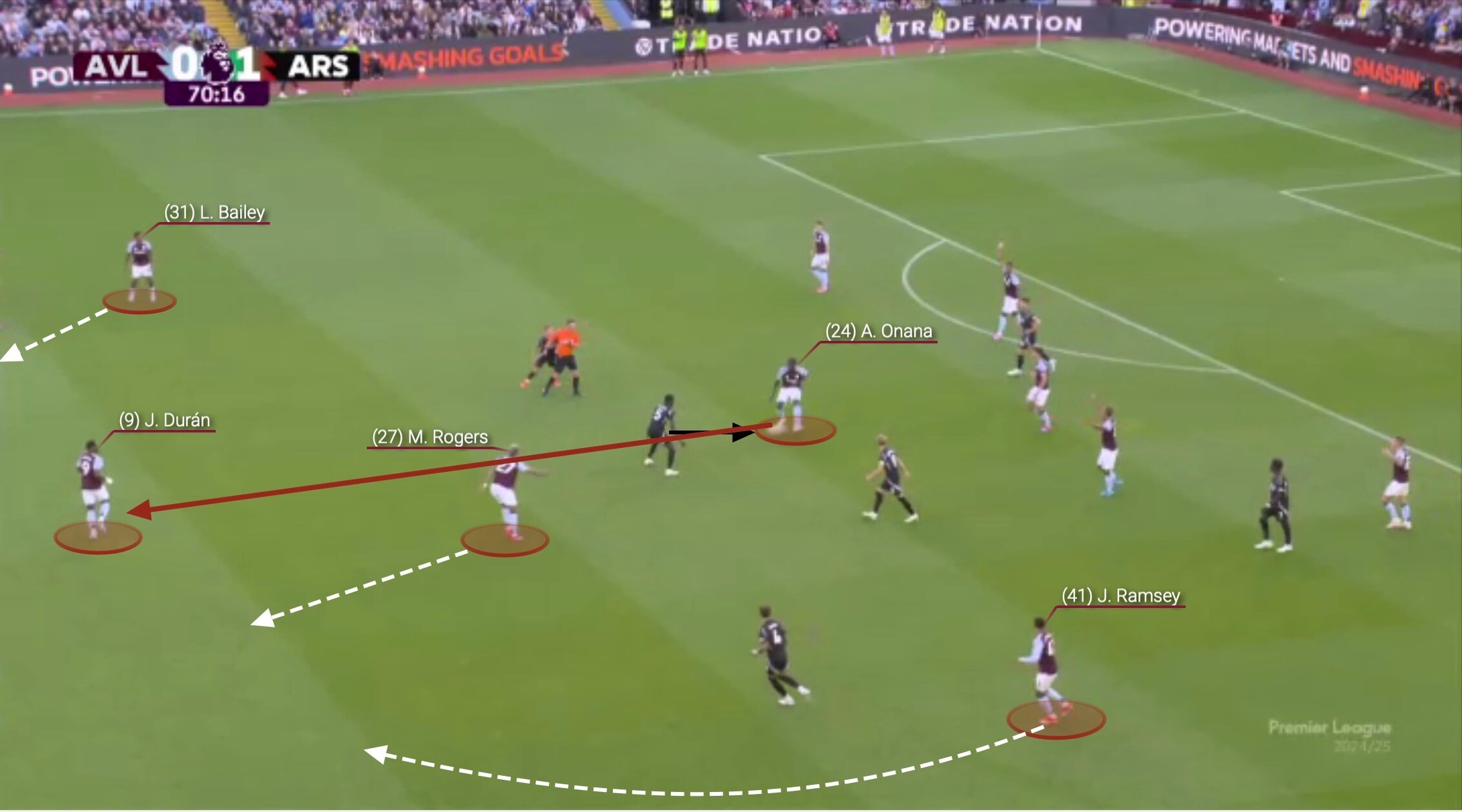 ومع انضمام أونانا في الصيف، وتطور أداء روجرز بشكل ملحوظ، وعودة رامسي إلى كامل لياقته البدنية، أصبح لدى فيلا عدائون قادرون على مهاجمة المساحات المفتوحة، بالإضافة إلى قدرة ماكجين على الاحتفاظ بالكرة. ومن اللافت للنظر أن أونانا حصل على ترخيص للهجوم ضد آرسنال، مع تواجد تيليمانس في خط الوسط.