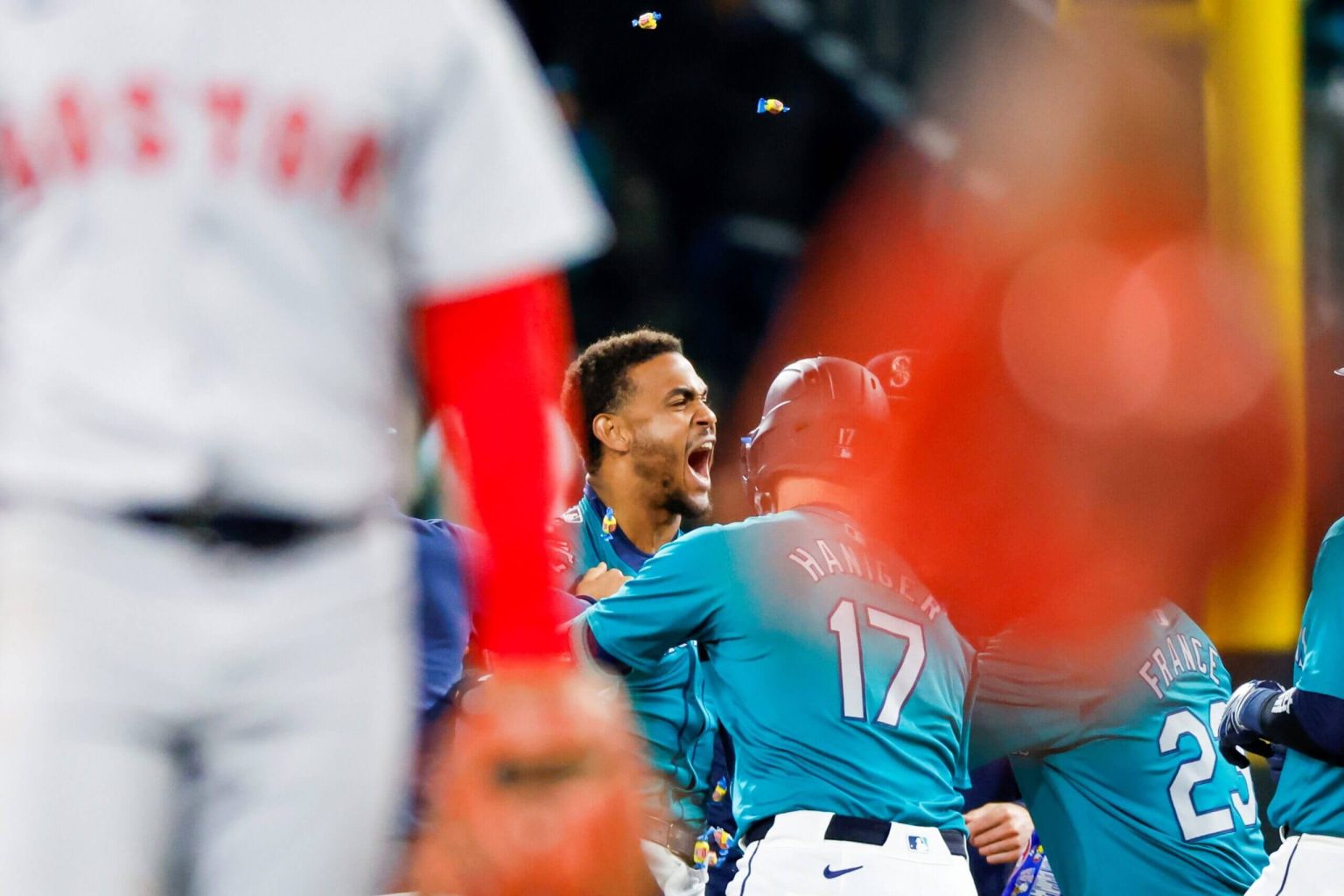 (صورة لخوليو رودريجيز من فريق مارينرز وهو يحتفل بأغنيته المنفردة في RBI بينما يغادر فريق Red Sox الملعب في الشوط العاشر يوم السبت: جو نيكلسون / USA Today)