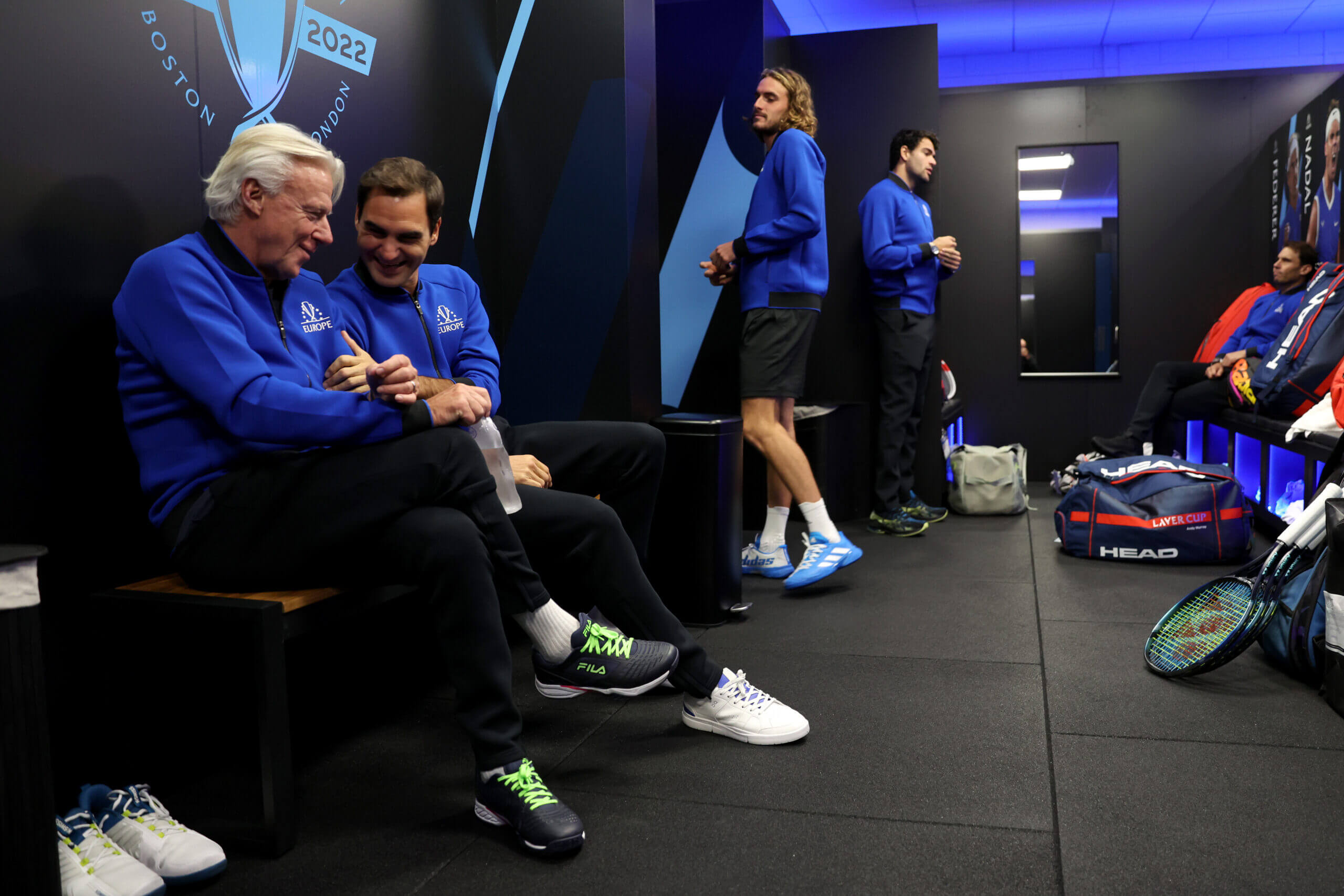 بورج وفيدرر في غرفة تبديل الملابس لفريق أوروبا في كأس لافر 2022 (كلايف برونسكيل / صور جيتي لكأس لافر)