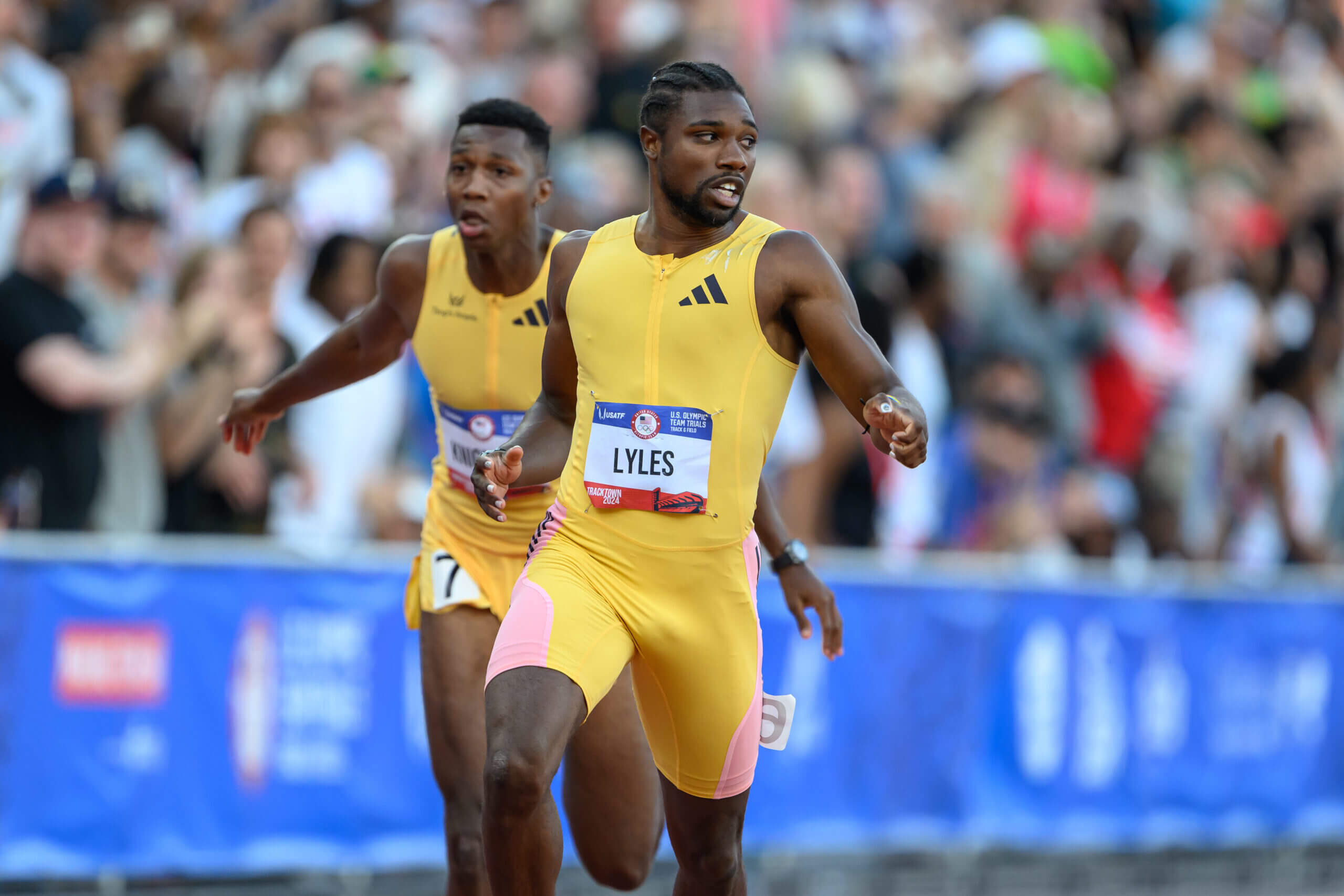 يوجين، أوريغون – سجل نوح لايلز أسرع وقت في العالم في سباق 200 متر للرجال – 19.53 ثانية – ليفوز بالميدالية الذهبية في التجارب الأولمبية الأمريكية لألعاب القوى.