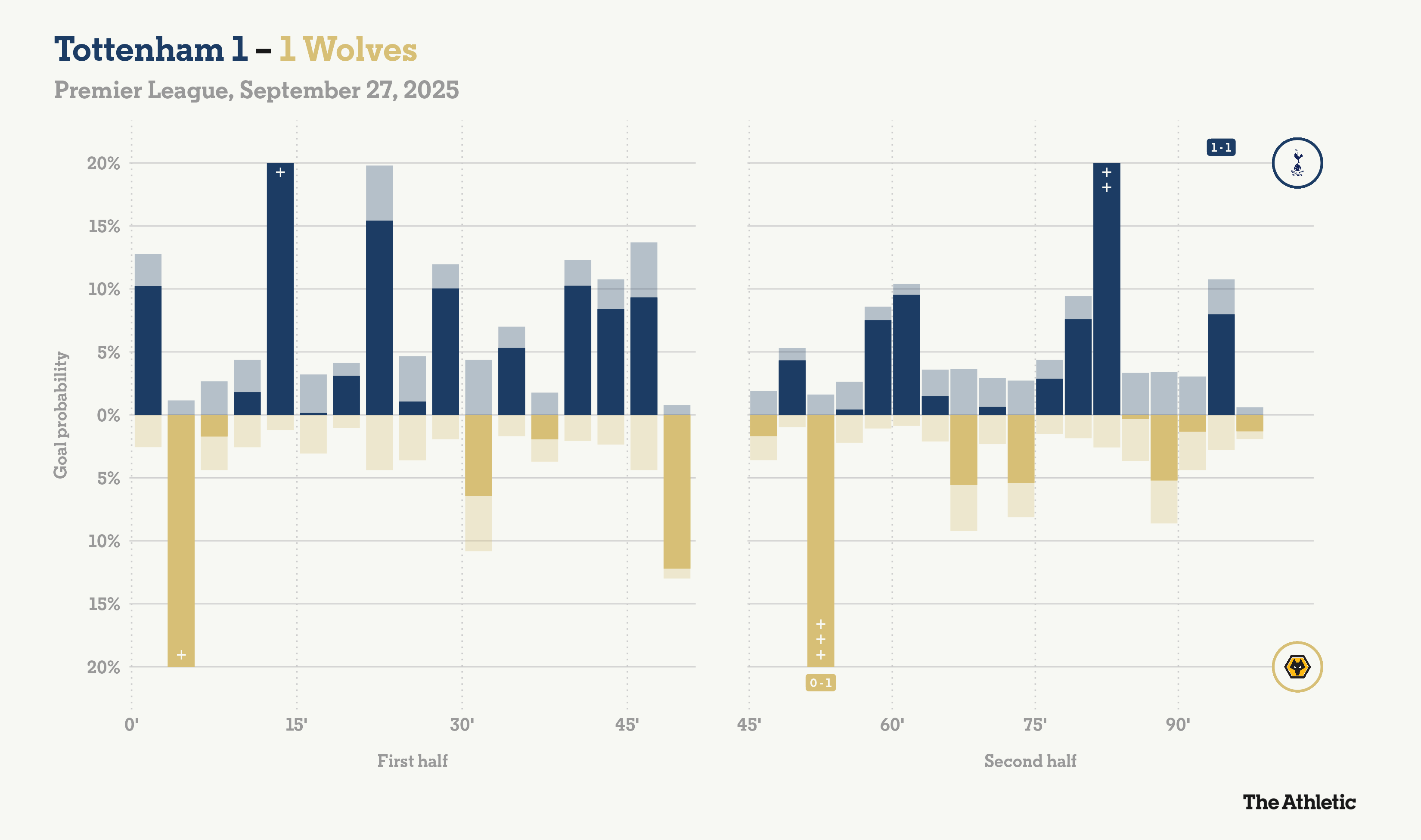 إنهم يظهرون احتمال كل فريق للتسجيل خلال كل فترة (أشرطة أخف) والفرق بين فرص تسجيل الفرق في تلك الفترة (الشريط الأغمق على جانب الفريق المهيمن).