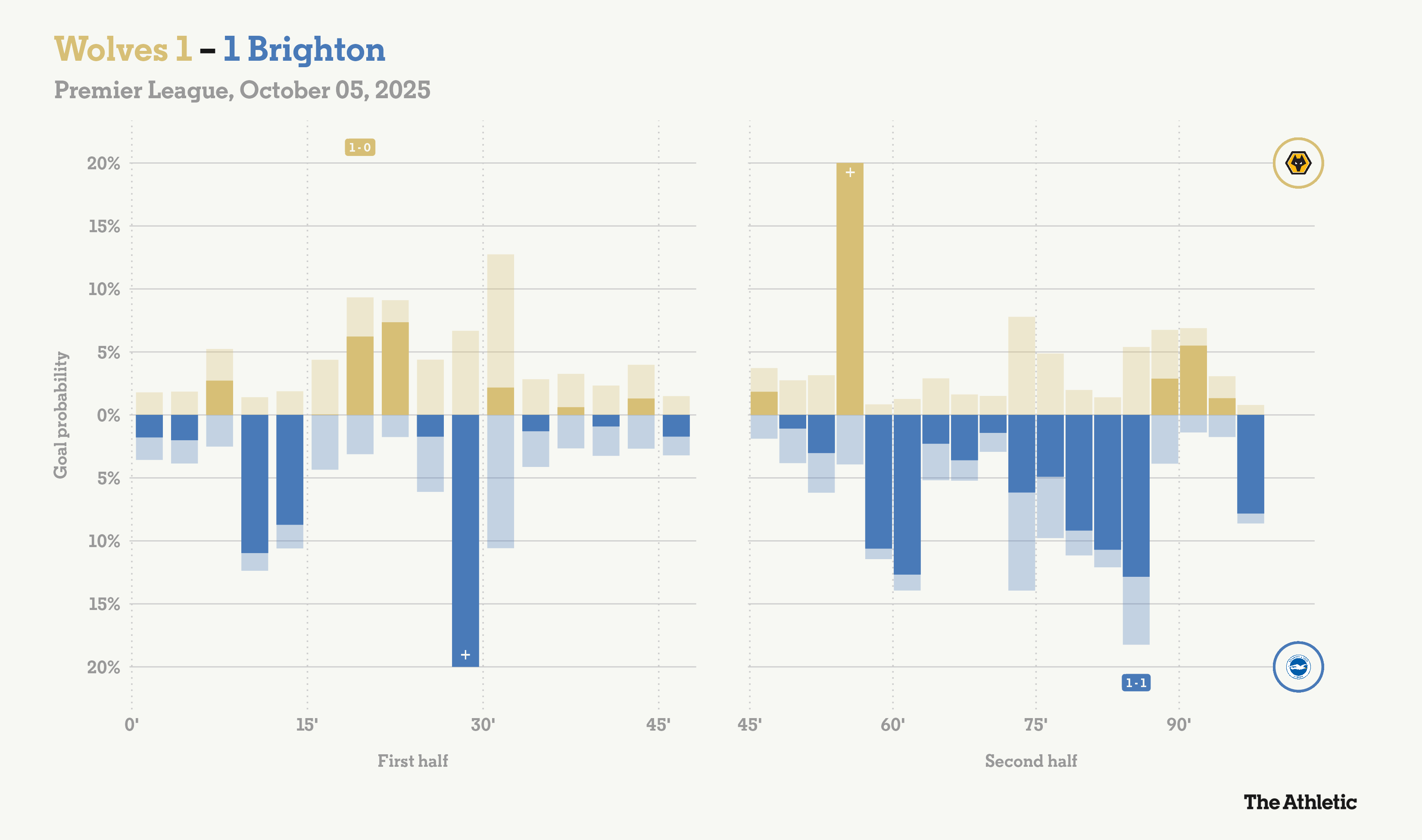 يؤكد الرسم البياني من أمس على كيفية تشكل برايتون كل التهديد من علامة الساعة حتى وصل التعادل الذي لا مفر منه على ما يبدو ، مع توليد الذئاب بعض الزخم الهجوم فقط بعد أن تم ربطهم.