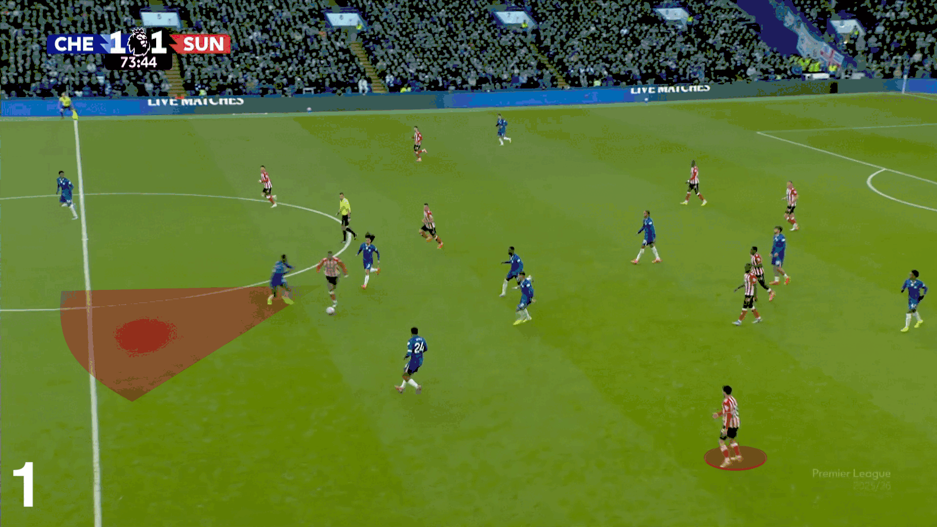 في الإطار الأول، لدى إيسيدور الذي يمتلك الكرة خيار محاولة الالتفاف والانطلاق في المساحة المفتوحة خلف الخط الخلفي لتشيلسي، لكنه يرصد إنزو لو في على اليسار.
