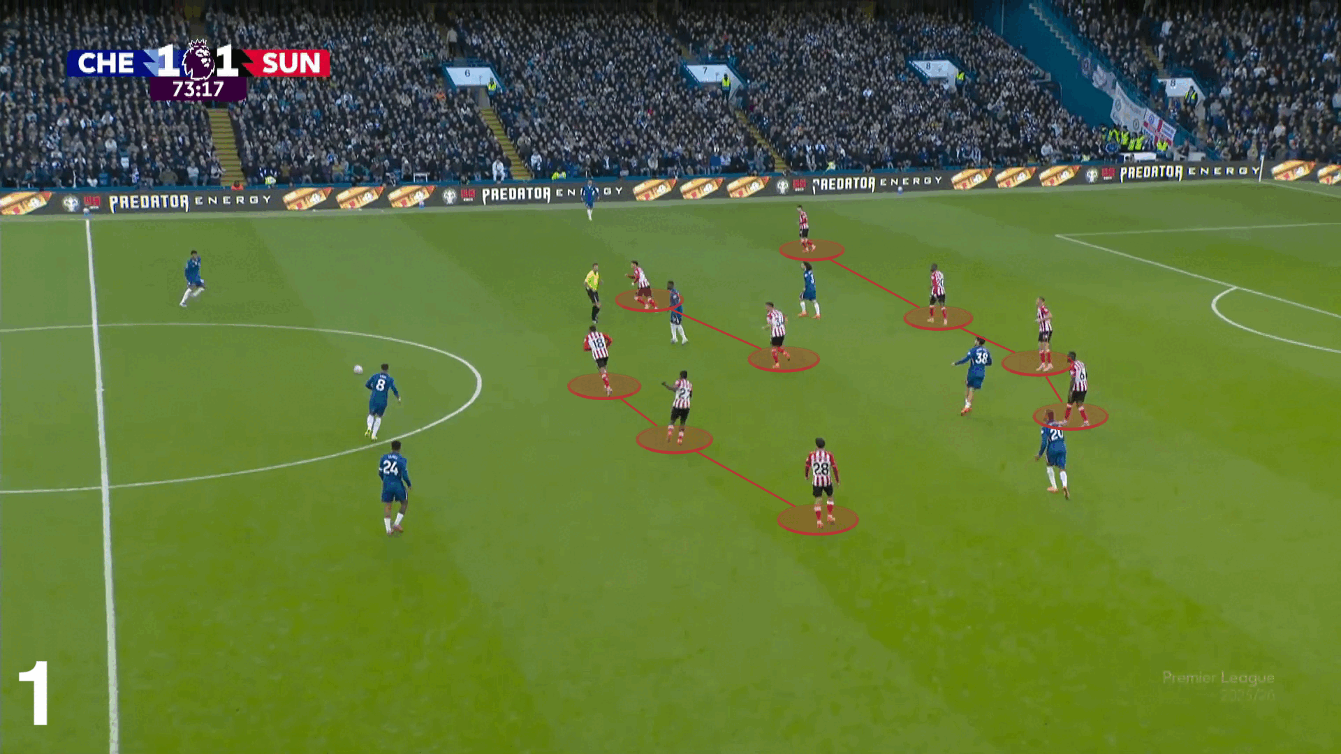 عندما يحاول تشيلسي التحرك عبر وسط الملعب، يخنق سندرلاند الكرة ويحصل على فرصة للرد، لكنه يظهر صبرًا حاسمًا.