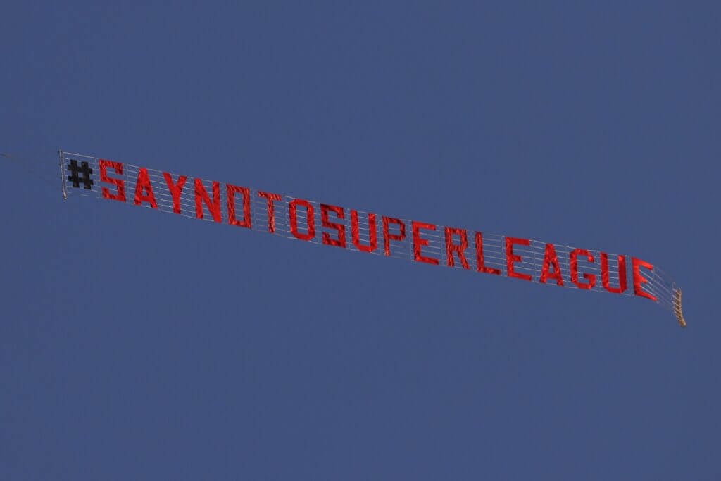 لافتة معارضة للدوري الممتاز (Clive Brunskill/POOL/AFP عبر Getty Images)