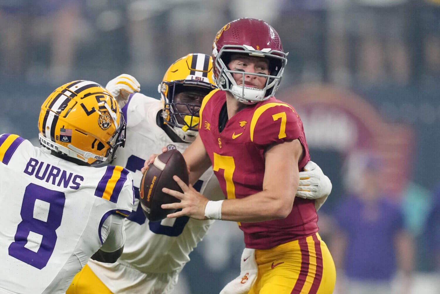 في مواجهة بين لاعبي الوسط الجدد الذين يتعين عليهم شغل مكان كبير ومنسقي الدفاع الجدد الذين يتعين عليهم تنظيف الفوضى الكبيرة، تفوق فريق يو إس سي المصنف رقم 23 على فريق لويزيانا المصنف رقم 13 بنتيجة 27-20 في لاس فيجاس مساء الأحد في واحدة من أفضل مباريات أول عطلة نهاية أسبوع كاملة لكرة القدم الجامعية. وسجل وودي ماركس هدفًا من مسافة 13 ياردة قبل ثماني ثوانٍ من نهاية المباراة ليتوج سلسلة نهائية محمومة، حيث تبادل الفريقان النقاط.