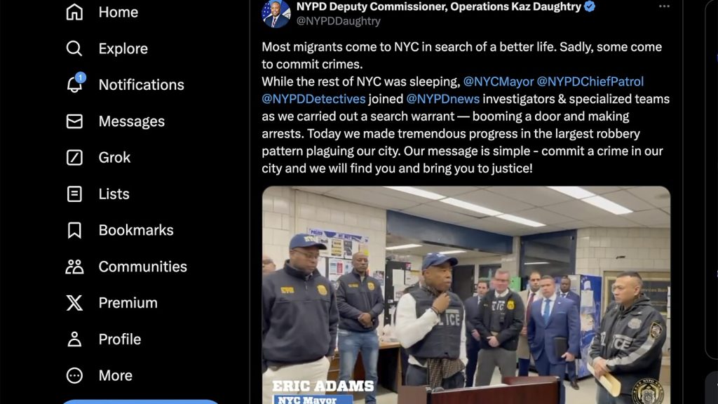 واحد فيديو من الشهر الماضي ظهر آدامز وهو يحشد الضباط قبل مداهمة في الصباح الباكر على مبنى سكني عام. تم اقتياد ثلاثة رجال مكبلي الأيدي، وصفهم كاز دوتري، نائب مفوض العمليات، بأنهم “مهاجرون يفترسون سكان نيويورك الضعفاء”.