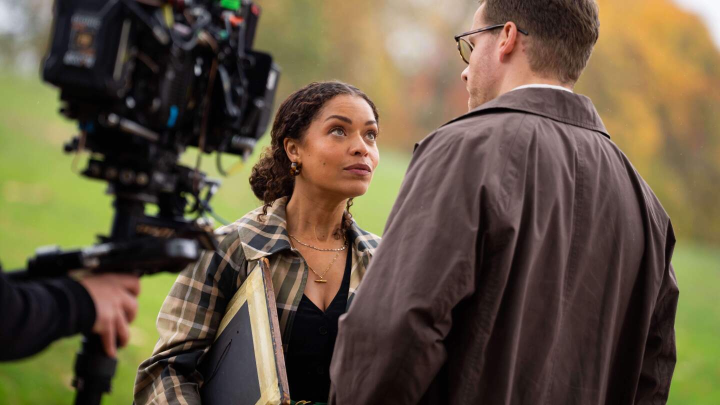 تظهر أنطونيا توماس، على اليسار، وجوش ديلان في موقع تصوير مسلسل أجاثا كريستي “تومي وتوبنس” في بيكونزفيلد، إنجلترا يوم الأربعاء 29 أكتوبر 2025. (تصوير سكوت أ. غارفيت / إنفيجن / ا ف ب)