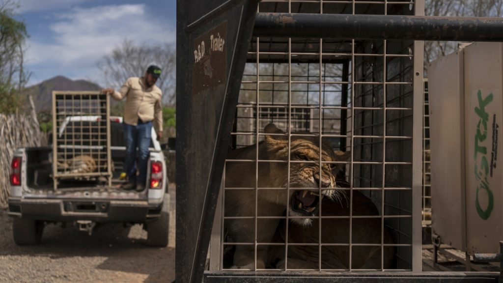 يتم تنفيذ أسد إلى قفص النقل في ملجأ الحيوانات أوستوك ، على مشارف كولياكان ، المكسيك ، الاثنين ، 19 مايو 2025. (AP Photo/Felix Marquez)