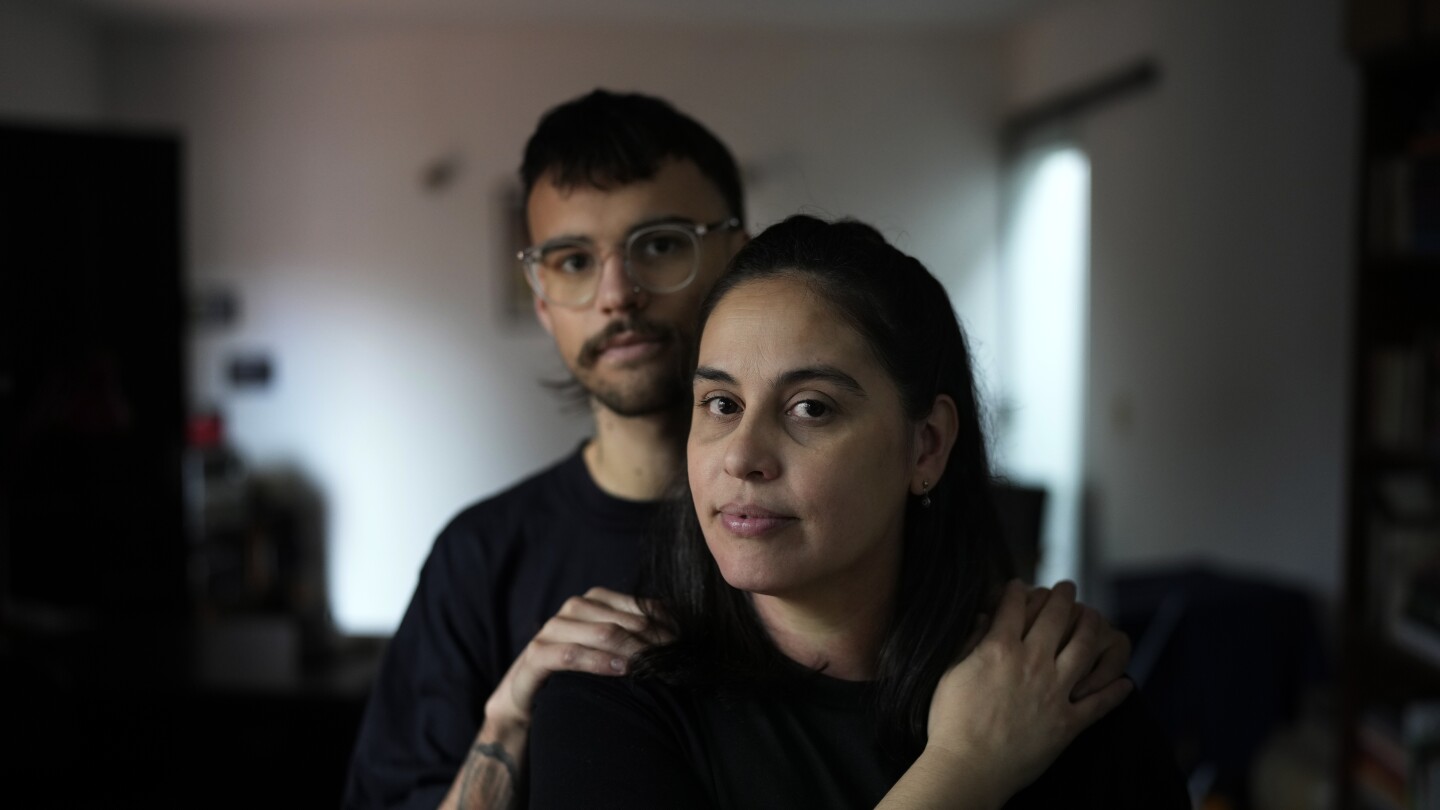ديانا زالازار، 39 عامًا، تعرض صورة لها مع ابنها أتو في منزلها في لامباري، باراجواي، الجمعة 23 أغسطس 2024. (AP Photo/Jorge Saenz)