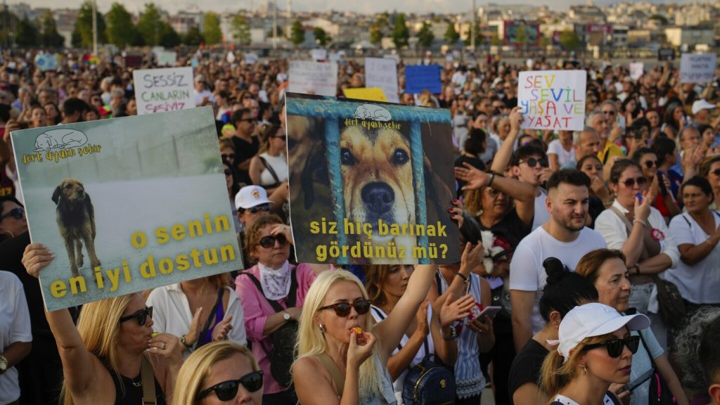 اسطنبول (أ ب) – تجمع آلاف المتظاهرين في اسطنبول يوم الأحد للاحتجاج على التشريع الأخير الذي يقول المنتقدون إنه يؤدي إلى قتل الكلاب الضالة في جميع أنحاء تركيا.