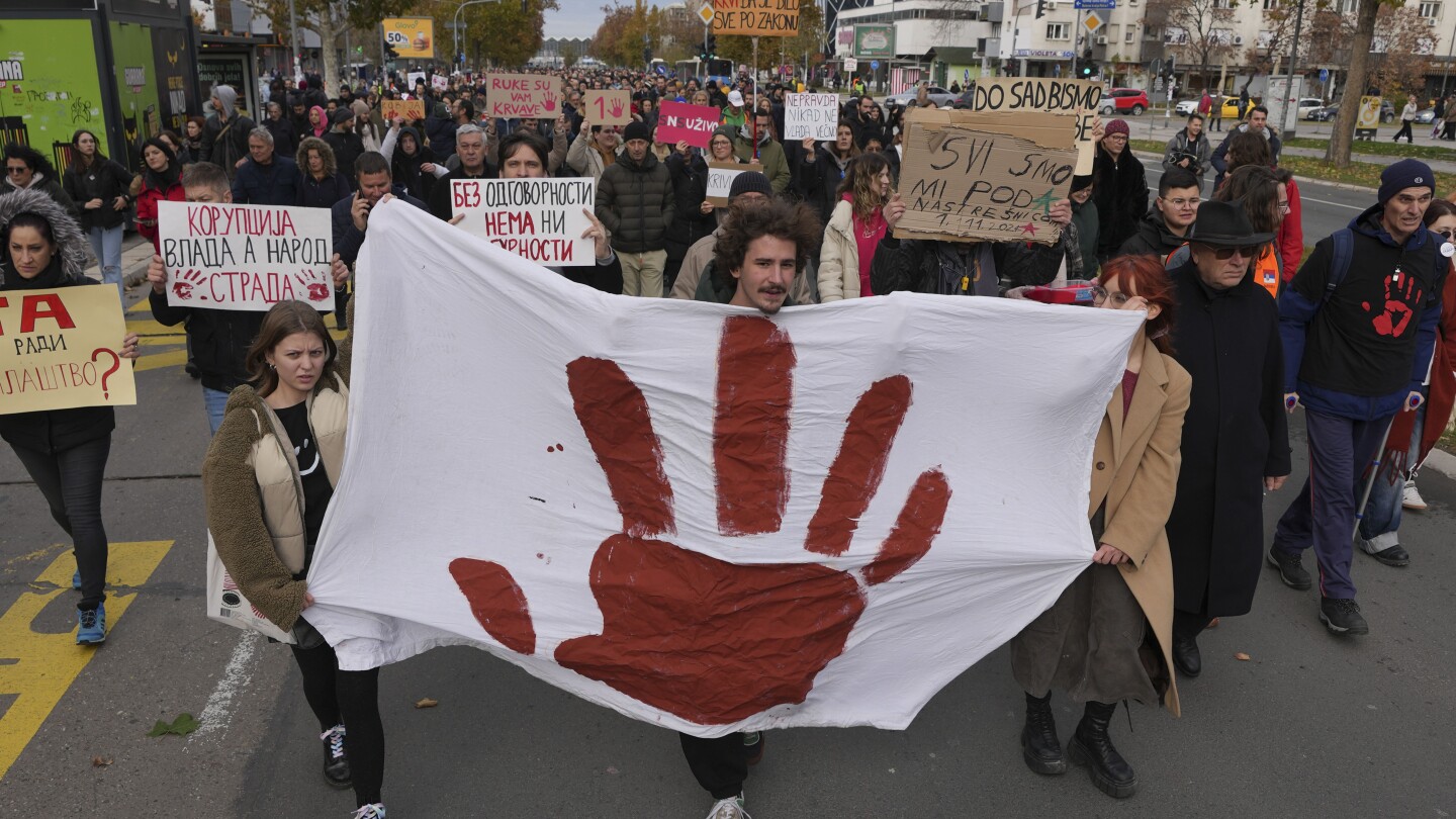 نوفي ساد ، صربيا (AP) – انضم الآلاف إلى مسيرة احتجاجية يوم الأحد في مدينة نوفي ساد بشمال صربيا بمناسبة مرور شهر على… انهارت المظلة الخرسانية خارج محطة السكة الحديد بالمدينةمما أسفر عن مقتل 15 شخصا وإصابة اثنين.