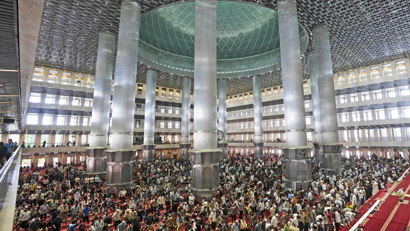 رجال مسلمون يحضرون صلاة الجمعة في مسجد الاستقلال في جاكرتا بإندونيسيا، الجمعة 9 أغسطس/آب 2024، حيث من المقرر أن يعقد البابا فرانسيس اجتماعًا بين الأديان في 5 سبتمبر/أيلول. (AP Photo/Tatan Syuflana)