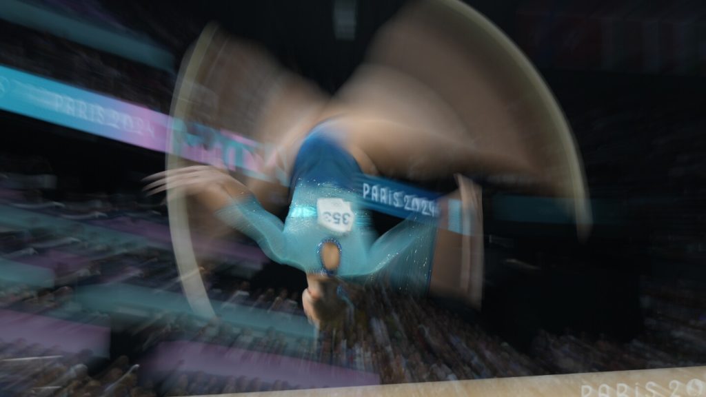 في هذه الصورة الملتقطة بسرعة غالق بطيئة، يتنافس إيليا كوفتون من أوكرانيا خلال نهائيات الجمباز الفني الفردي للرجال في بيرسي أرينا في دورة الألعاب الأولمبية الصيفية 2024، السبت 3 أغسطس 2024، في باريس، فرنسا. (AP Photo/Charlie Riedel)