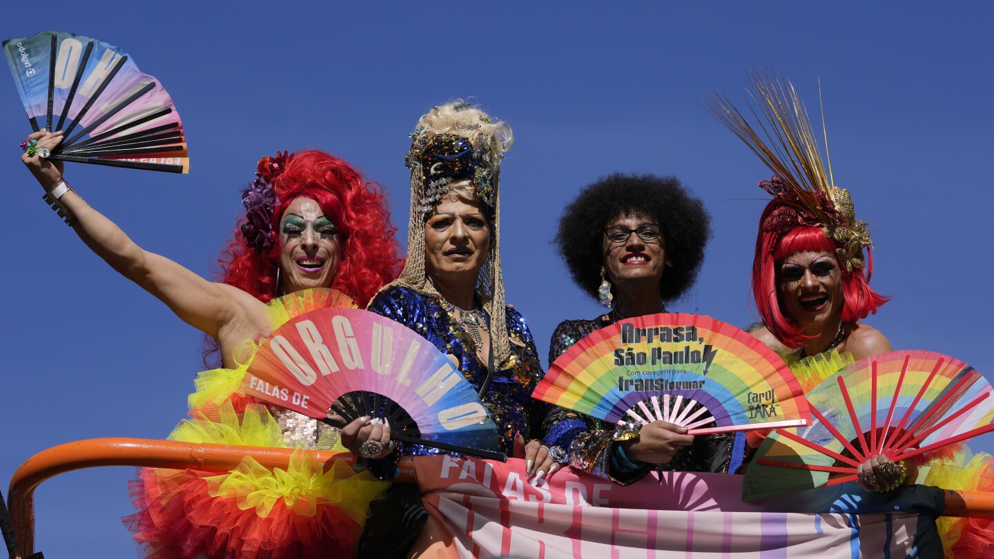 ساو باولو ، البرازيل (AP) – اختلط اللونان الأصفر والأخضر المميزان لعلم البرازيل مع بحر من تنورات قصيرة بألوان قوس قزح ومراوح يدوية وتسريحات شعر ملكة السحب في يوم الأحد موكب فخر LGBTQ+ في ساو باولو، البرازيل.