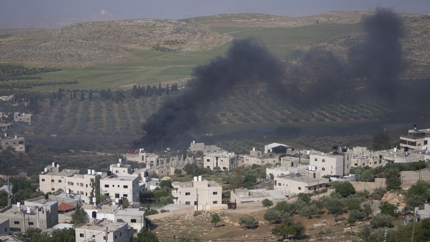 الدخان يملأ السماء بعد أن أضرم المستوطنون الإسرائيليون النار في ممتلكات القرويين الفلسطينيين في قرية المغير بالضفة الغربية، السبت 13 أبريل 2024. يقول الجيش الإسرائيلي إنه تم العثور على جثة مراهق إسرائيلي مفقود في الضفة الغربية المحتلة بعد مقتله في “هجوم إرهابي”. وأدى اختفاء الطفل بنيامين أحيماير (14 عاما) إلى هجوم كبير شنه المستوطنون على القرية الفلسطينية يومي الجمعة والسبت. (صورة AP / ناصر ناصر)