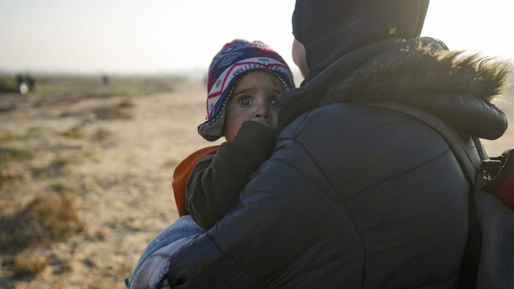 امرأة فلسطينية تحمل طفلها أثناء عودتها إلى منزلها في شمال قطاع غزة، في أعقاب قرار إسرائيل بالسماح لآلاف منهم بالعودة للمرة الأولى منذ الأسابيع الأولى من الحرب التي استمرت 15 شهرًا مع حماس، يوم الاثنين، 13 كانون الثاني/يناير. 27 تشرين الثاني/نوفمبر 2025. (صورة AP/عبد الكريم هناء)