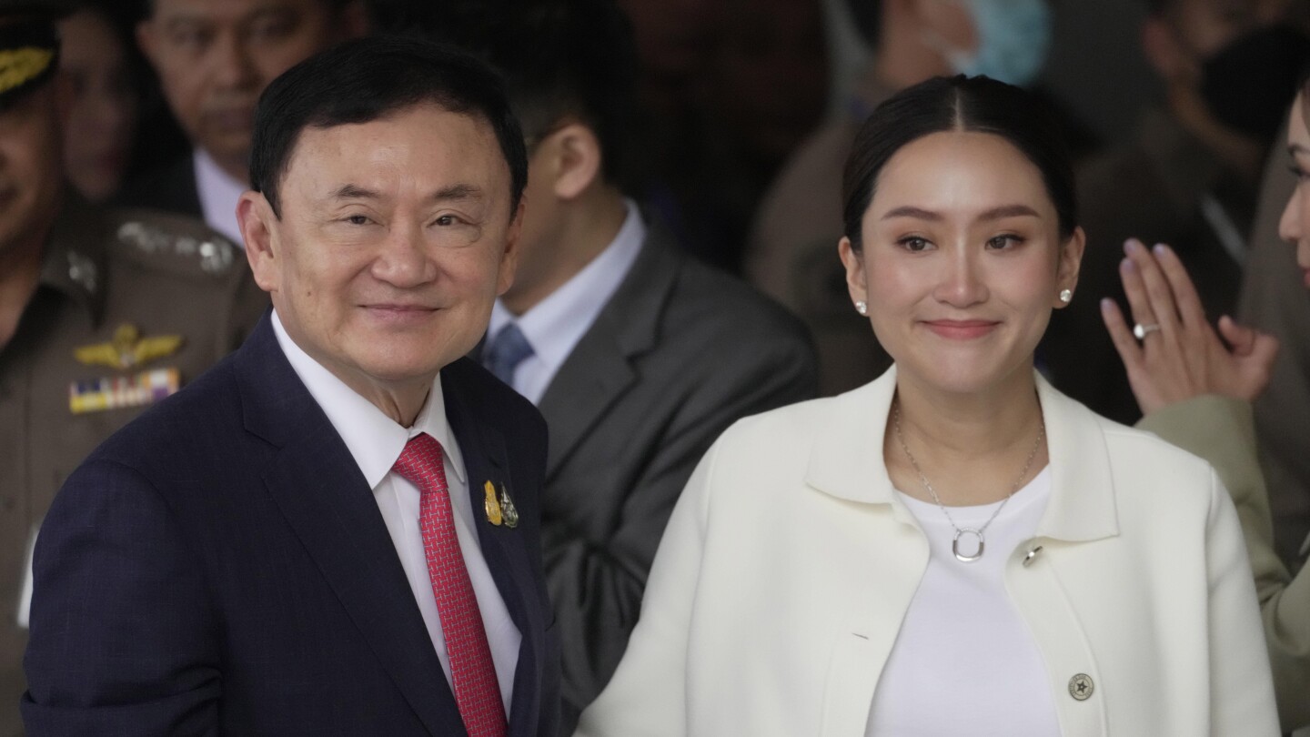 ملف – رئيس الوزراء التايلاندي السابق تاكسين شيناواترا، على اليسار، مع ابنته بايتونجتارن، يصلان إلى مطار دون موينج في بانكوك، تايلاند، الثلاثاء 22 أغسطس 2023. (AP Photo/Sakchai Lalit, File)