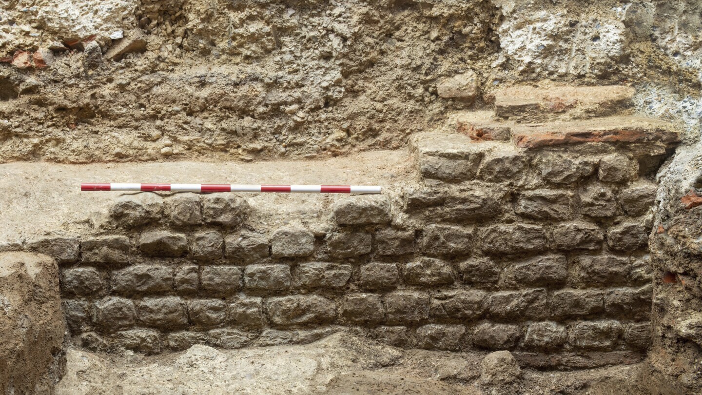 الحفريات في الطابق السفلي من مبنى مقرر هدمه للبرج في 85 شارع Gracechurch الكشف عن جدران ، من الطوب والراجون والأسس ، بعرض واحد (أكثر .