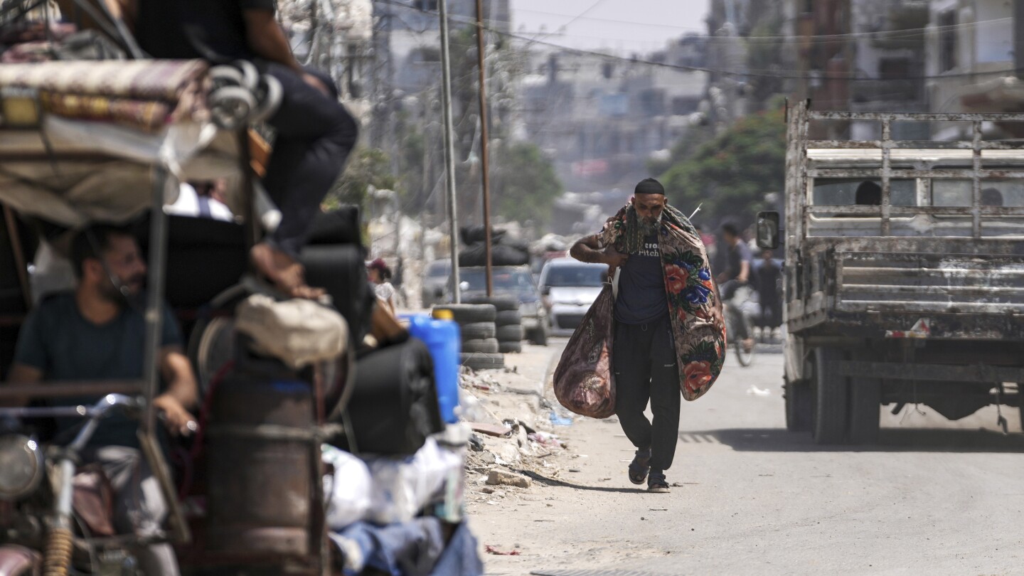 يحمل فلسطيني أمتعته أثناء إخلائه مخيم المغازي للاجئين في وسط قطاع غزة، كجزء من الإخلاء الجماعي الذي أمر به الجيش الإسرائيلي قبل العملية، السبت 17 أغسطس 2024. (AP Photo/Abdel Kareem Hana)