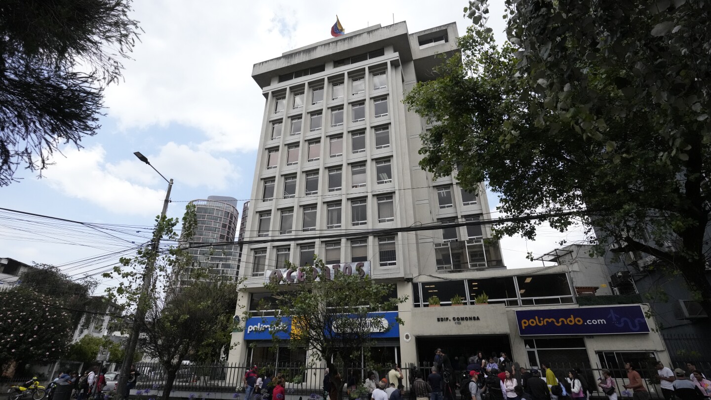 الناس ينتظرون دخول السفارة الفنزويلية حيث تحرس الشرطة الإكوادورية في كيتو، الإكوادور، الثلاثاء 16 أبريل 2024. أمر الرئيس الفنزويلي نيكولاس مادورو بإغلاق سفارة بلاده وقنصلياتها في الإكوادور يوم الثلاثاء تضامنا مع المكسيك في احتجاجها على مداهمة السلطات الإكوادورية للسفارة المكسيكية في كيتو.  (صورة AP / دولوريس أوتشوا)