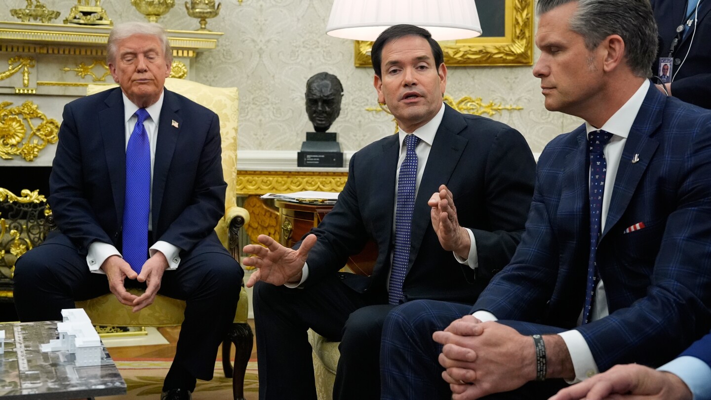 يستمع الرئيس دونالد ترامب ووزير الدفاع بيت هيجسيث بينما يتحدث وزير الخارجية ماركو روبيو خلال اجتماع مع الأمين العام لحلف شمال الأطلسي مارك روتي في المكتب البيضاوي بالبيت الأبيض، الأربعاء 22 أكتوبر 2025، في واشنطن. (صورة AP / أليكس براندون)