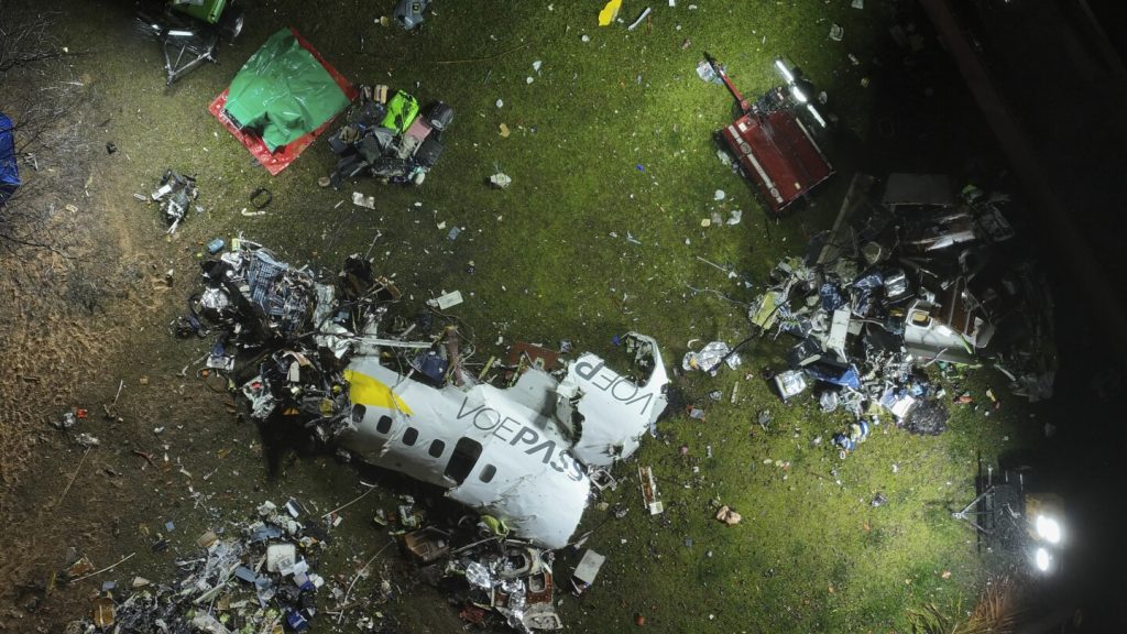 عملت السلطات البرازيلية يوم السبت على جمع المعلومات حول سبب تحطم الطائرة في ولاية ساو باولو في اليوم السابق والذي أسفر عن مقتل جميع من كانوا على متنها وعددهم 62 شخصًا. كانت طائرة شركة الطيران المحلية فويباس، وهي من طراز ATR 72 بمحركين توربينيين، متجهة إلى مطار ساو باولو الدولي في جوارولوس وعلى متنها 58 راكبًا و4 أفراد من الطاقم عندما سقطت في مدينة فينيدو. (AP Video/Andre Penner and Maycron Abade)