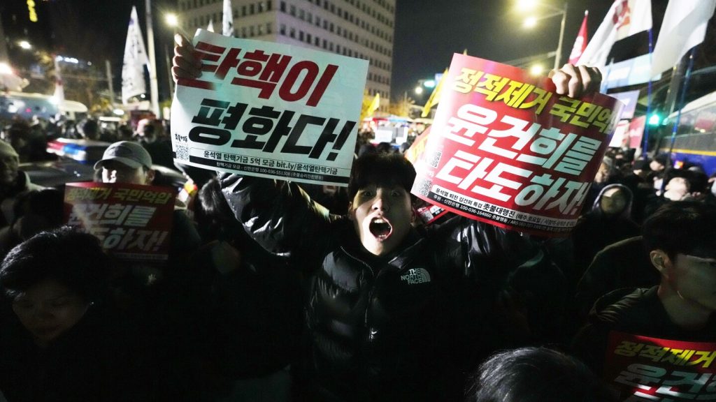 ويبدو أن مئات المتظاهرين تجمعوا أمام الجمعية، ولوحوا باللافتات ودعوا إلى عزل يون.