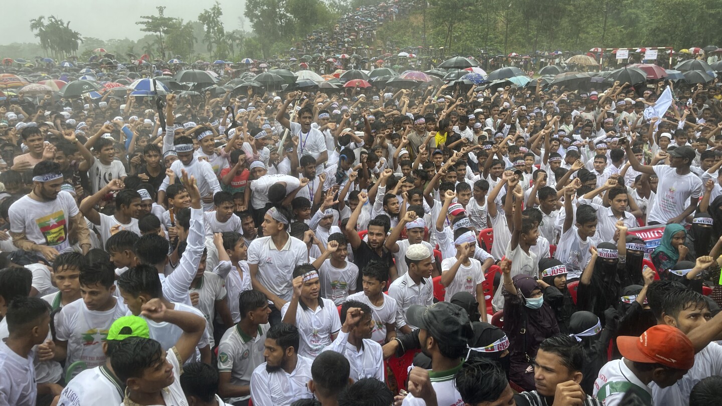 وتجمع اللاجئون في حقل مفتوح بمخيم كوتوبالونج في منطقة كوكس بازار حاملين لافتات وأكاليل كتب عليها “الأمل هو الوطن” و”نحن الروهينجا مواطنو ميانمار”، متحدين المطر في يوم يُعرف بأنه “يوم الإبادة الجماعية للروهينجا”.