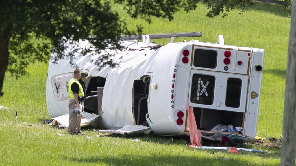 عمال الطوارئ يعملون في مكان الحادث المميت لحافلة تقل عمالًا انقلبت صباح الثلاثاء، 14 مايو، 2024، في أوكالا، فلوريدا. (Doug Engle/Ocala Star-Banner via AP)