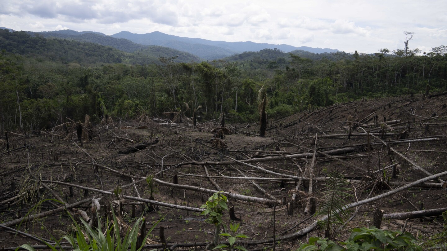 تقع الأشجار المقطوعة في عرض حديقة كورديليرا أزول الوطنية ، التي شوهدت في الخلفية بالقرب من مجتمع تشامبيرا ، في بيرو أمازون ، 3 أكتوبر ، 2022. (AP Photo/Martin Mejia ، ملف)